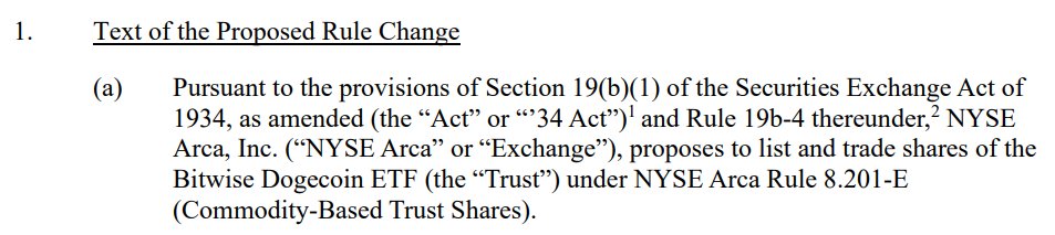 The NYSE Arca has proposed a rule change to list and trade shares of a Bitwise Asset Management Dogecoin exchange-traded fund (ETF).