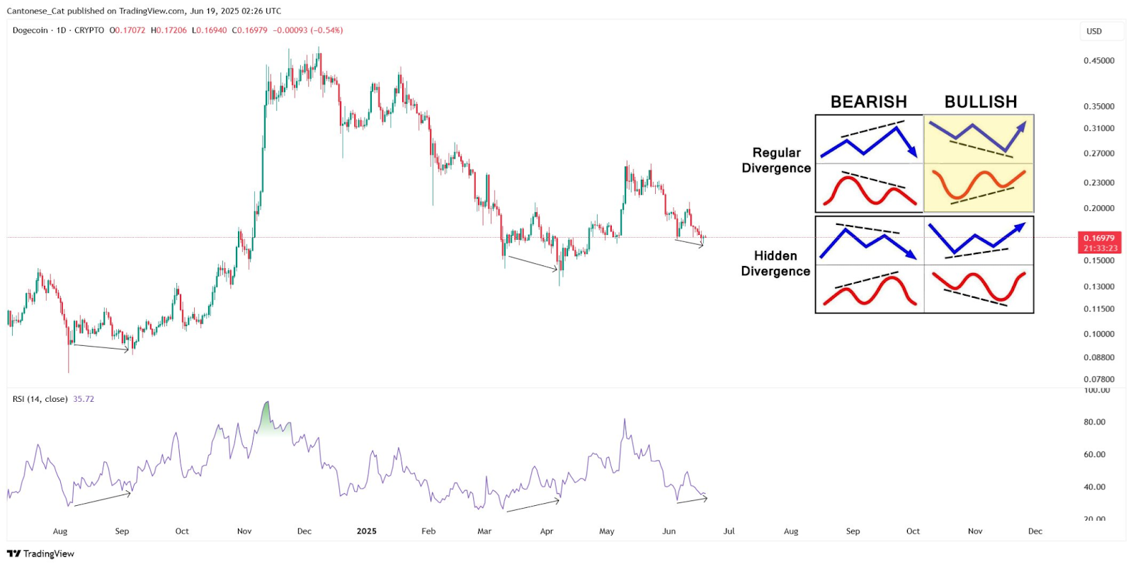 An analyst has identified a bullish divergence forming on Dogecoin’s (DOGE) daily chart. While the price of Dogecoin (DOGE) continues forming higher lows, the Relative Strength Index (RSI) is printing lower lows, which often signals a potential continuation of an uptrend.