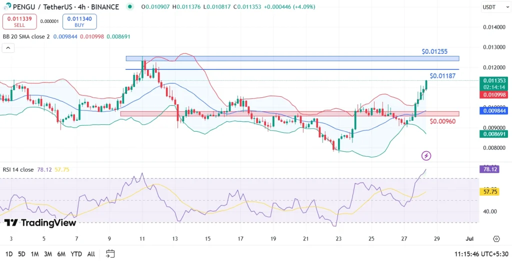 On the 4-hour chart, PENGU has broken through the critical resistance zone at $0.01187, and is now targeting the next resistance level at $0.01255. Bollinger Bands indicate increasing volatility, while the Relative Strength Index (RSI) has risen to 78.12, suggesting overbought conditions but also strong upward momentum.
