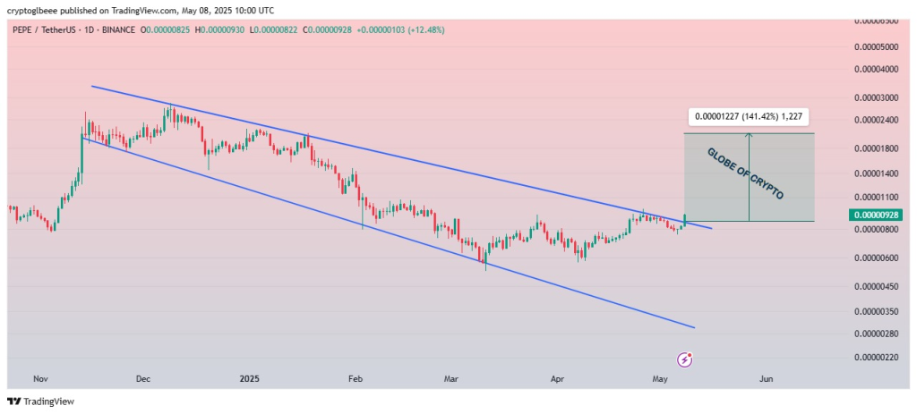 Analysts note that PEPE recently broke out of a Descending Broadening Wedge pattern – a bullish technical indicator – confirming a momentum shift with a strong daily close. This could potentially trigger a midterm rally of 120% to 140%. Continued bullish market sentiment and sustained uptrend could lead to even more substantial gains, potentially exceeding 1200%, with a price target of $0.000080 (a 10x increase from current levels) within the next bullish cycle. However, this is speculative and subject to market volatility.