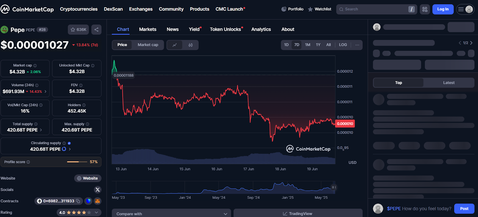 Trading volume offers further perspective. While PEPE's price increased by 2% in the last 24 hours, pushing its market capitalization above $4.3 billion, sentiment in online communities remains cautious. The chart continues to display lower highs, and the Relative Strength Index (RSI) hovers below 45. A break below the $0.0000105 support could lead to a decline towards $0.0000089, according to technical analysts.