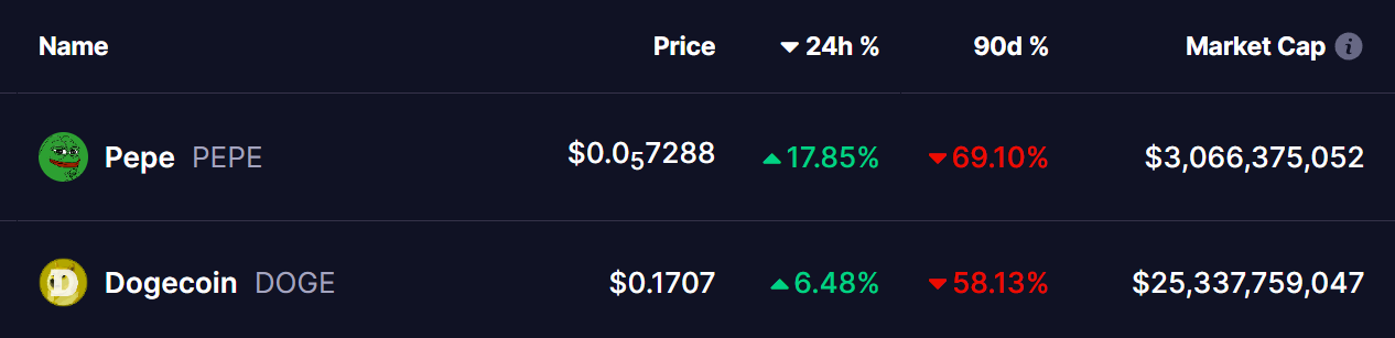 Both memecoins experienced significant declines over the past 90 days, but current market conditions indicate a potential recovery.