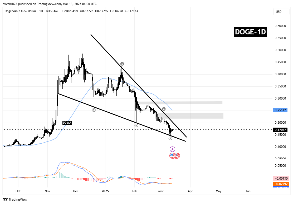 A confirmed breakout with a successful retest would place resistance between $0.22 and $0.24 (near the 50-day moving average). Surpassing this could lead to a rally towards $0.2862 (a potential 67% increase). Failure to break out might see DOGE remain within the wedge, potentially retesting lower support levels.