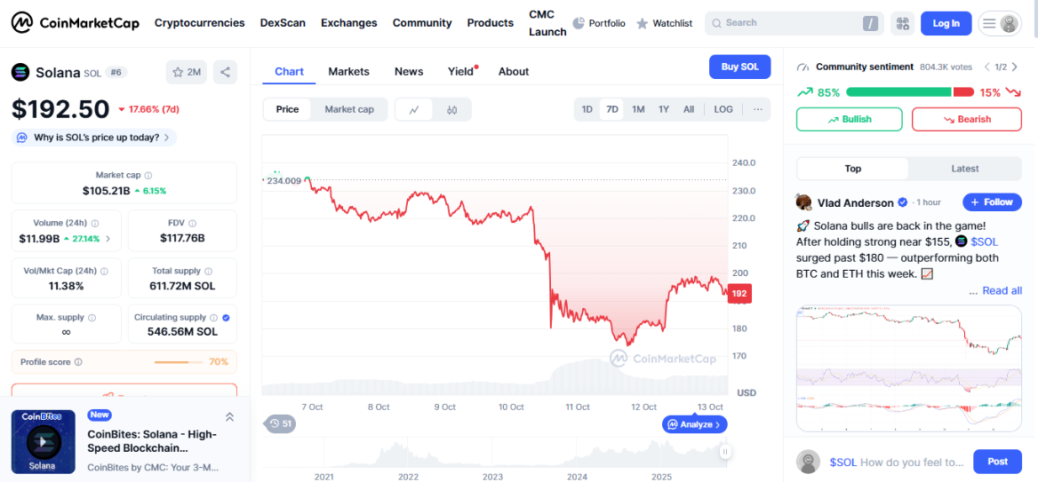 Solana trades near $192.50, hinting that recent softness could be a simple pause. The $190 zone remains a key level on the chart, while the long-term conversation still includes a push toward $1,000 if momentum holds. For anyone tracking a Solana price prediction, the setup looks supportive as demand improves.