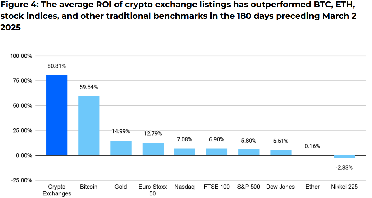 The report also revealed that 68% of crypto listings yielded positive ROI, exceeding the NYSE's 54% and Nasdaq's 51%.