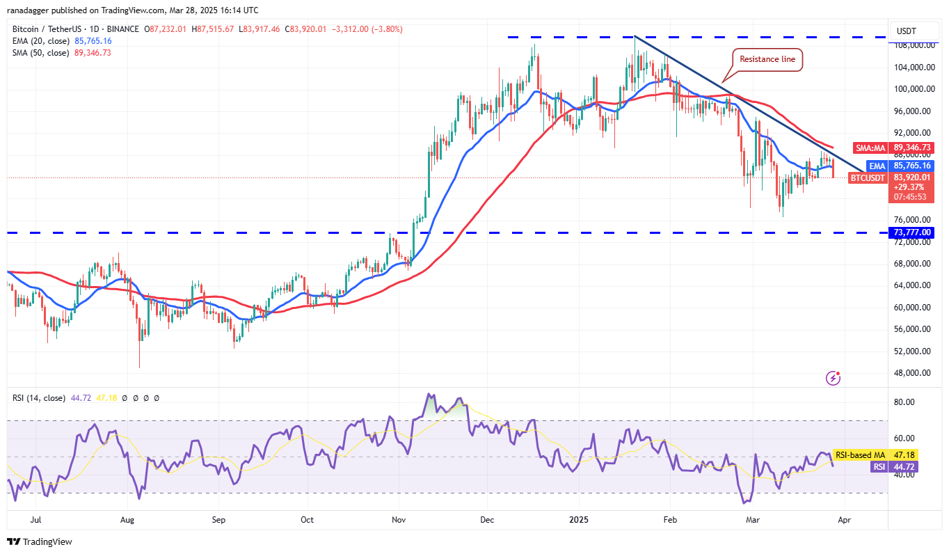 Bitcoin reversed course from resistance, breaking below the 20-day exponential moving average ($85,765) on March 28th.