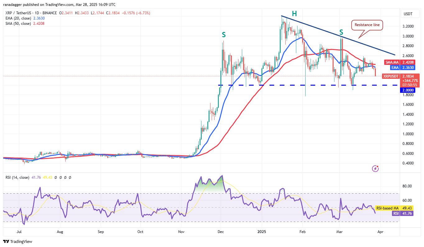 Solana (SOL) broke below the 20-day EMA ($136) on March 28th, indicating weak buying pressure.