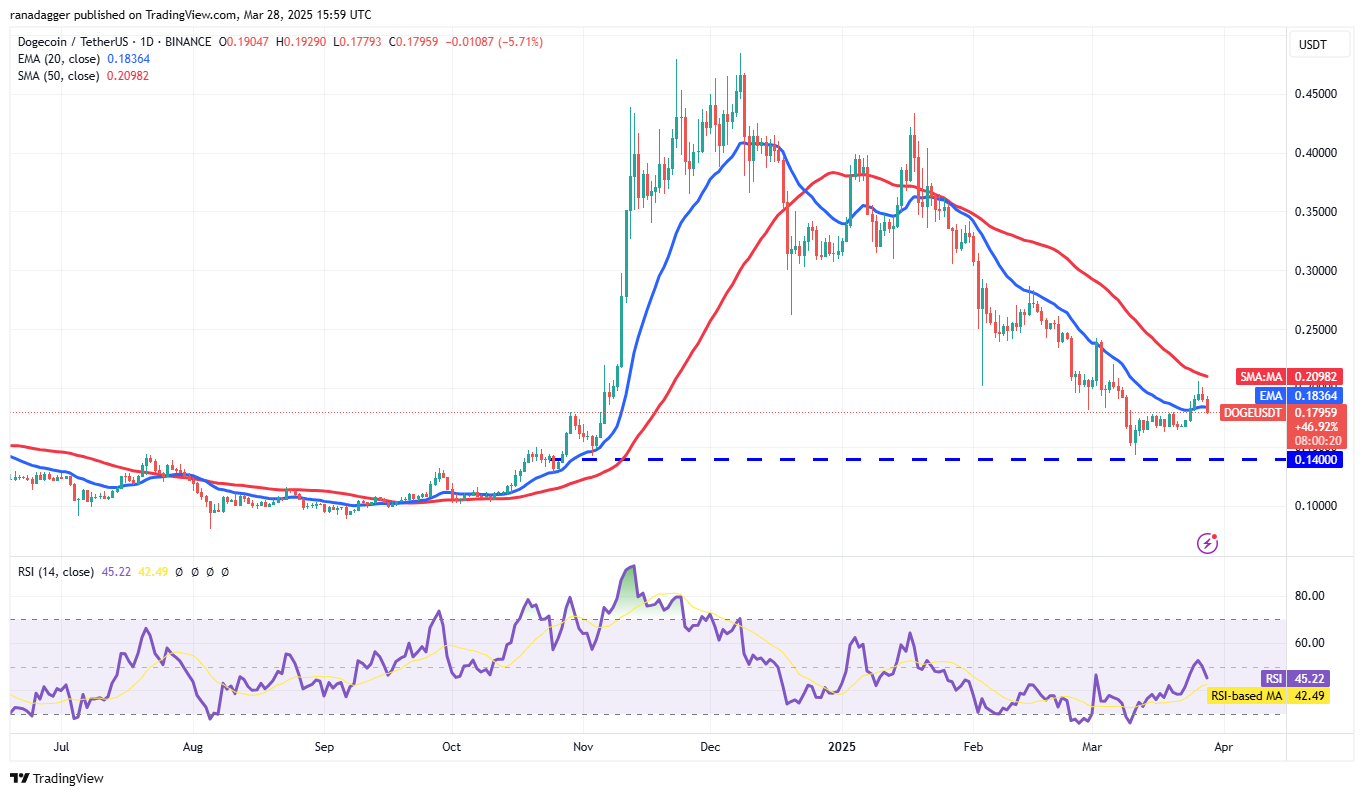 Dogecoin (DOGE) reversed from the 50-day SMA ($0.21) on March 26th, indicating negative sentiment.