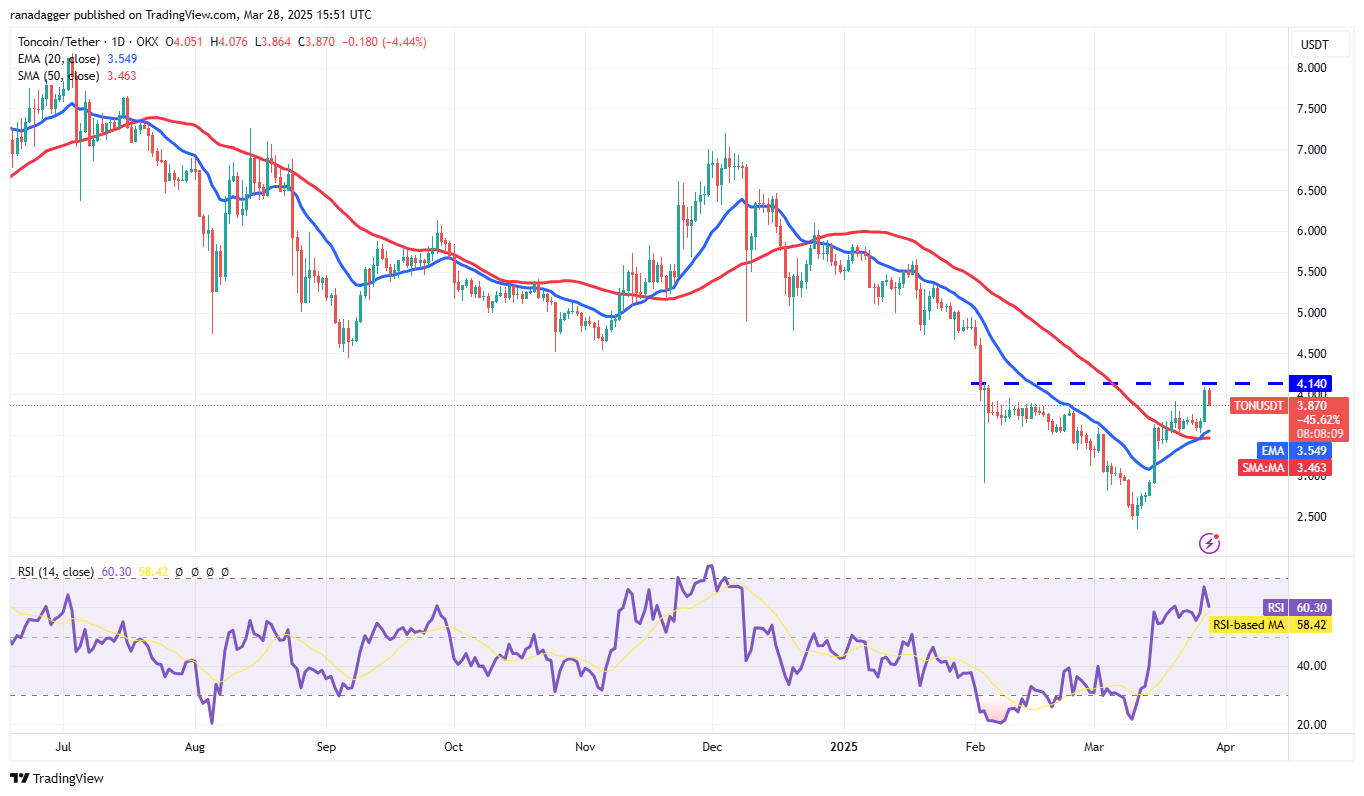 Toncoin (TON) rebounded from the 20-day EMA ($3.54) on March 26th, reaching resistance at $4.14 on March 27th.