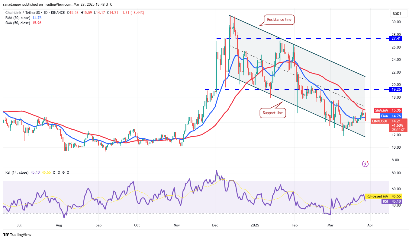 Chainlink (LINK) reversed from the 50-day SMA ($15.96) on March 28th, breaking below the 20-day EMA ($14.76), indicating selling on rallies.