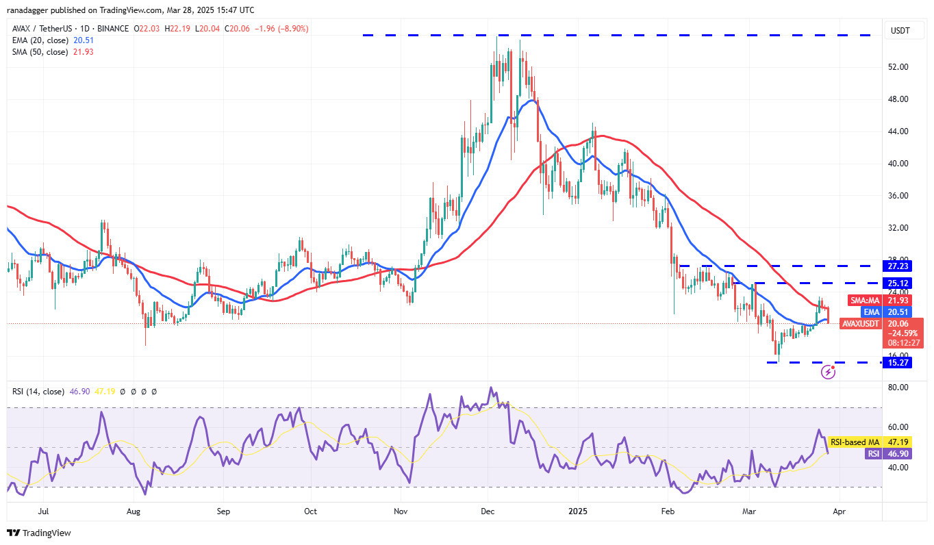 Avalanche (AVAX) failed to sustain above the 50-day SMA ($21.93), indicating bearish pressure at higher levels.