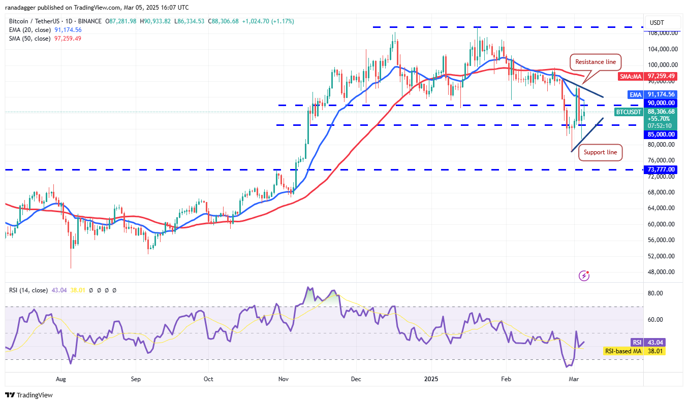 The BTC/USDT pair reached the 20-day exponential moving average ($91,174), a key resistance level. A decisive break above this EMA would signal reduced selling pressure, potentially leading to a push above the triangle's resistance line and towards the 50-day simple moving average ($97,259). A close above the 50-day SMA would confirm bullish momentum.