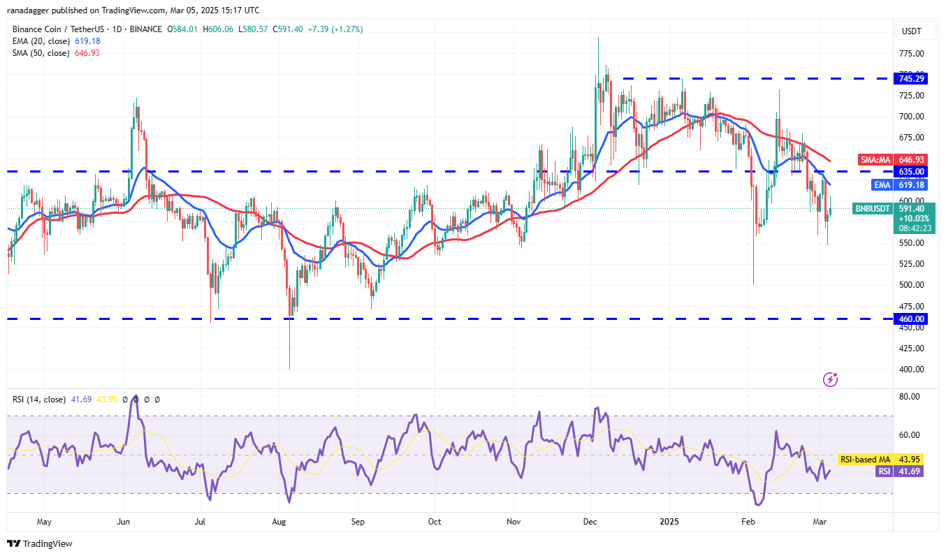 BNB (BNB) broke below the $557 support on March 4th, but the bears failed to sustain lower prices.