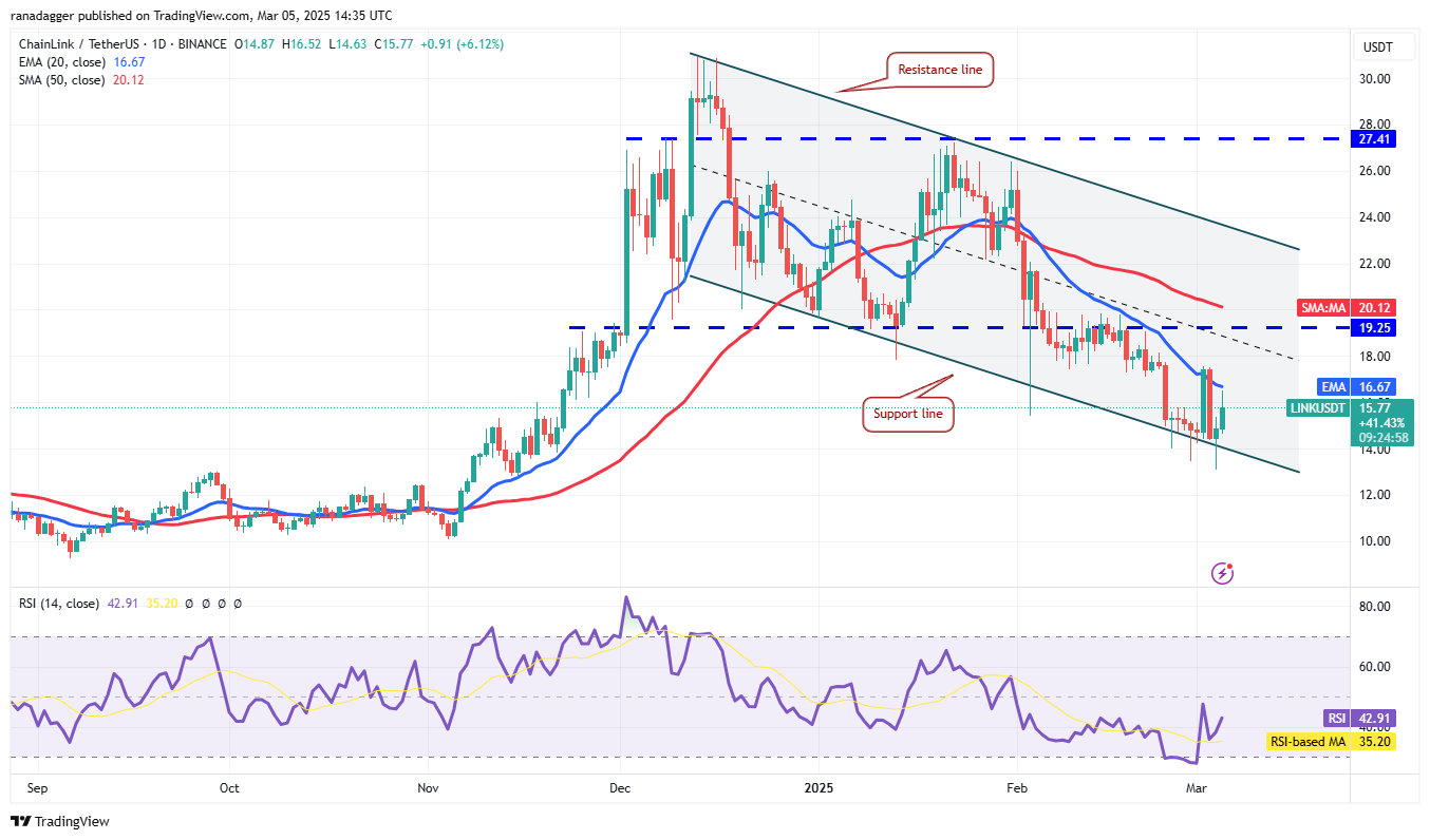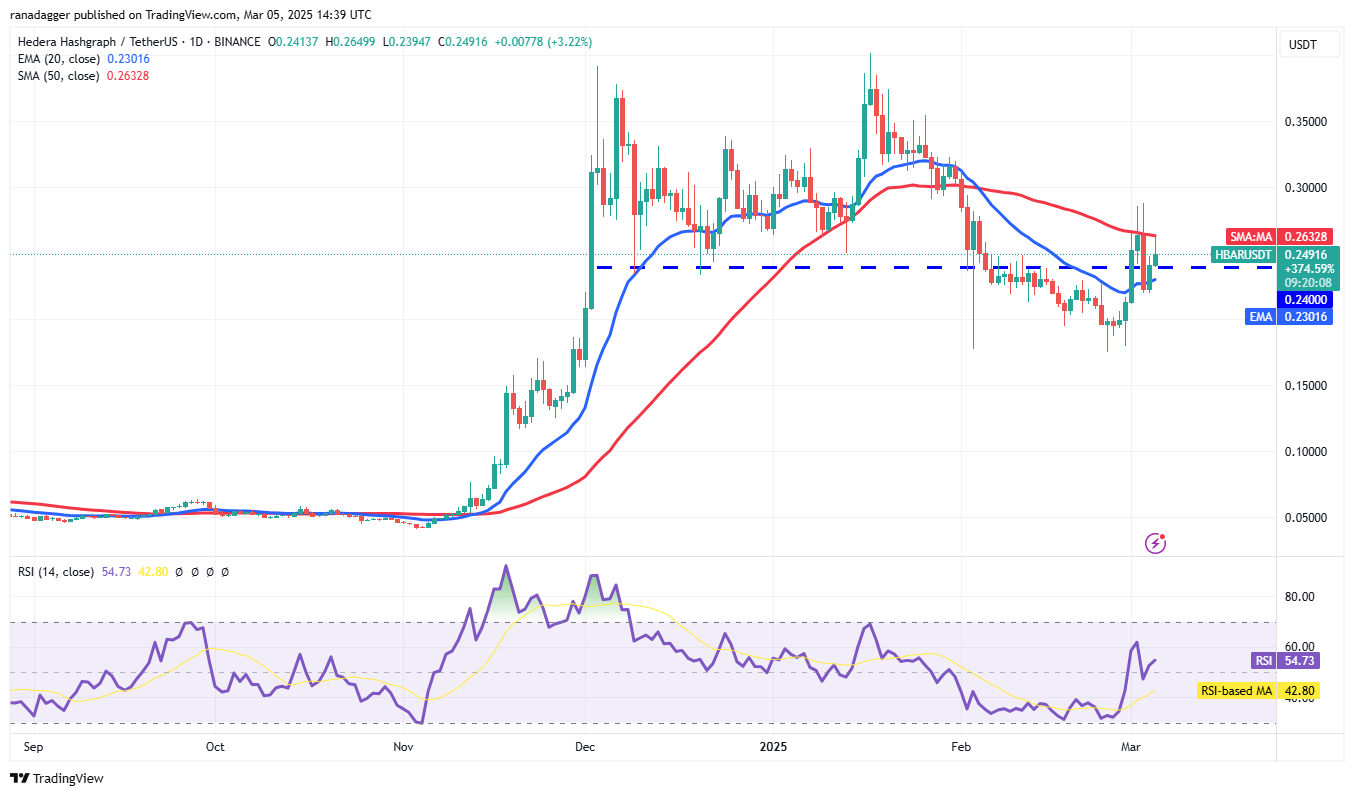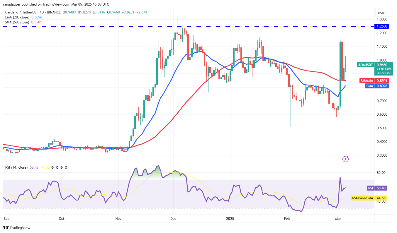 The ADA/USDT pair bounced off the 20-day EMA ($0.80) on March 4th, suggesting buying interest at lower levels. Holding above $1 could lead to another attempt to push the price to $1.25.