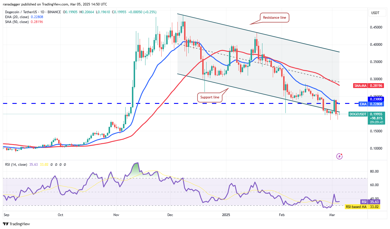 The bulls prevented a drop below the $0.18 support. A successful push and sustain above the 20-day EMA could indicate that the channel break was a bear trap, potentially leading to a rally to the 50-day SMA ($0.28).
