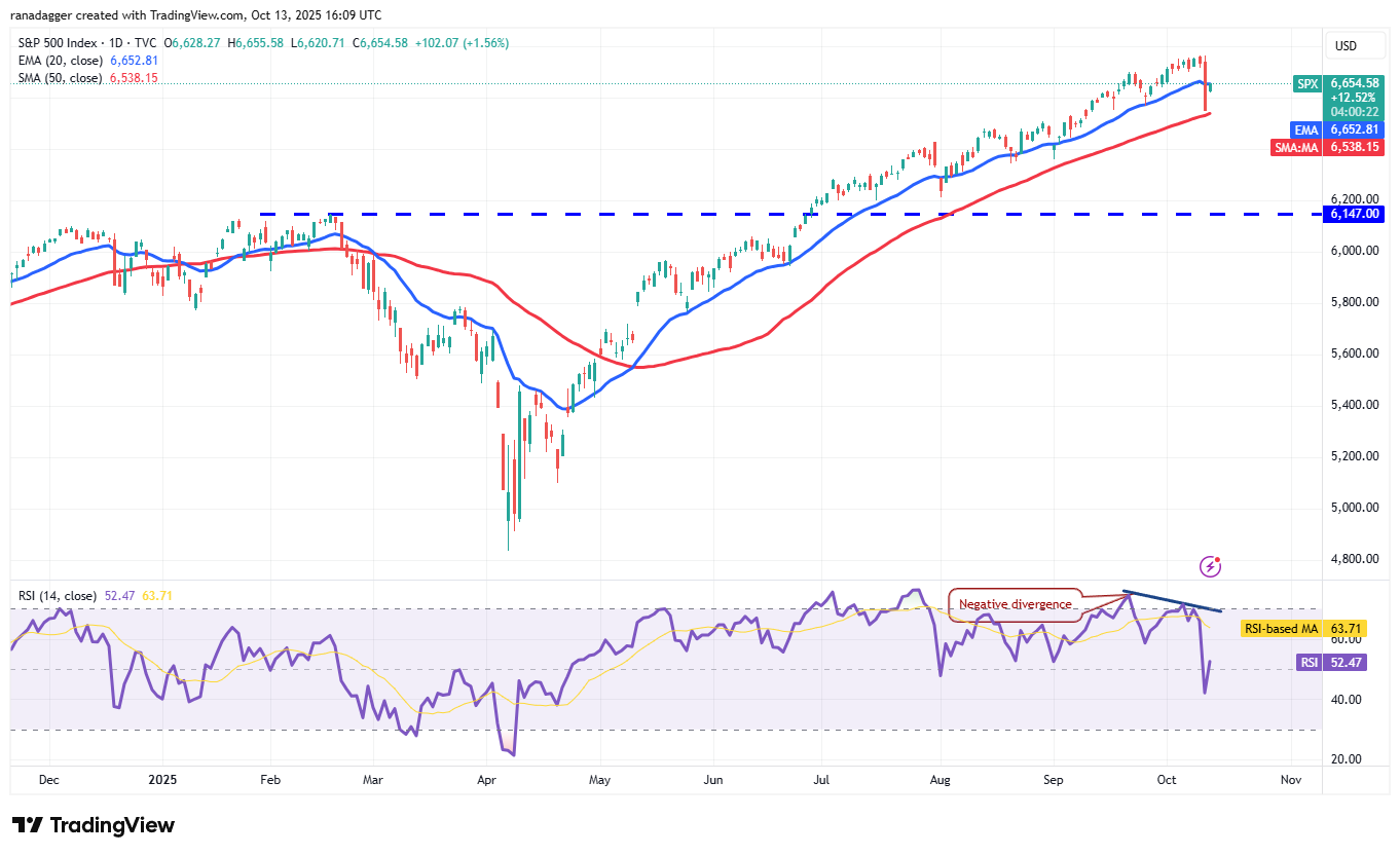 The bulls purchased the dip to the 50-day simple moving average (6,538) and have pushed the price to the 20-day EMA. If the price turns down sharply from the 20-day EMA, the bears will again try to sink the index below the 50-day SMA. If they succeed, the correction could deepen to 6,350 and then to 6,200.