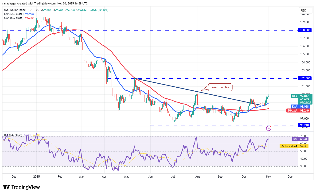 The index could rally to 100.50, where the bears are expected to mount a strong defense. If buyers do not allow the price to dip below the 20-day EMA, it increases the likelihood of a rally to the stiff overhead resistance at 102.
