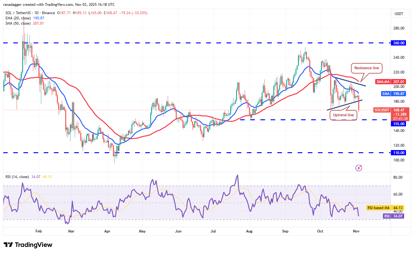 The SOL/USDT pair could tumble to the strong support at $155. Any rebound off the $155 level is likely to face selling at the 20-day EMA ($190). If that happens, the Solana price risks a drop to $137.