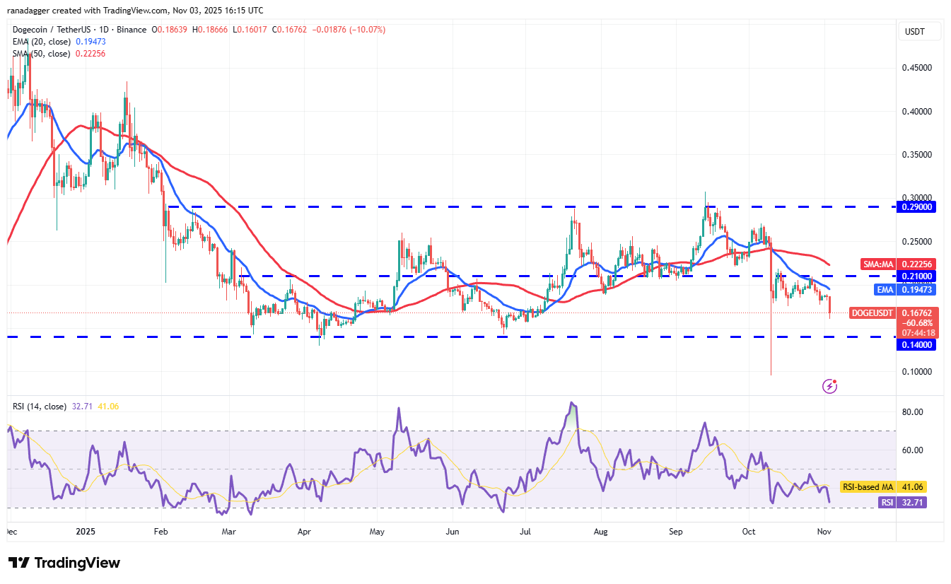 The DOGE/USDT pair is likely to decline to the solid support at $0.14, which is expected to attract buyers. If the price rebounds off the $0.14 support and rises above the moving averages, it suggests that the range-bound action may continue for some more time.