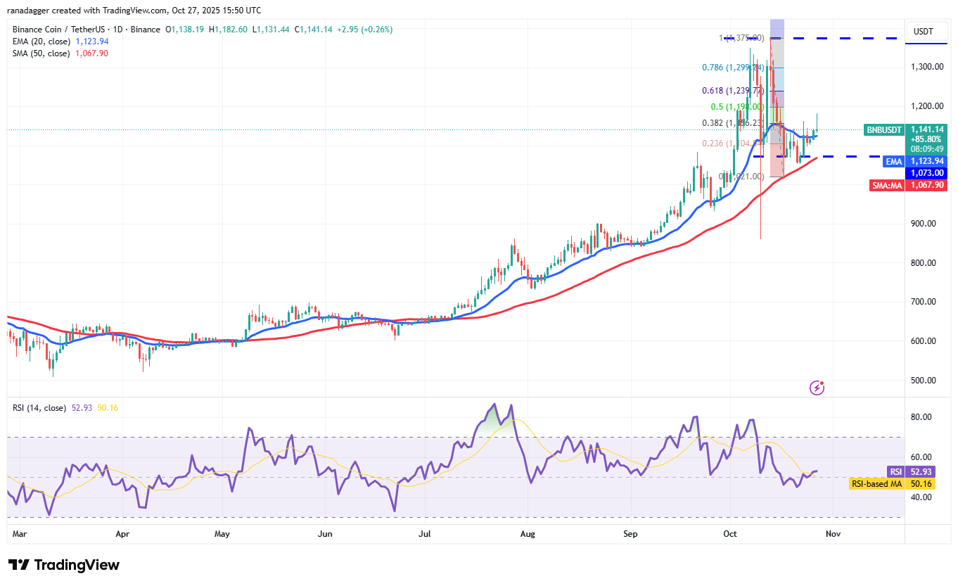 BNB (BNB) rose above the 38.2% Fibonacci retracement level of $1,156 on Monday, but the bulls could not sustain the higher levels, as seen from the long wick on the day’s candlestick.
