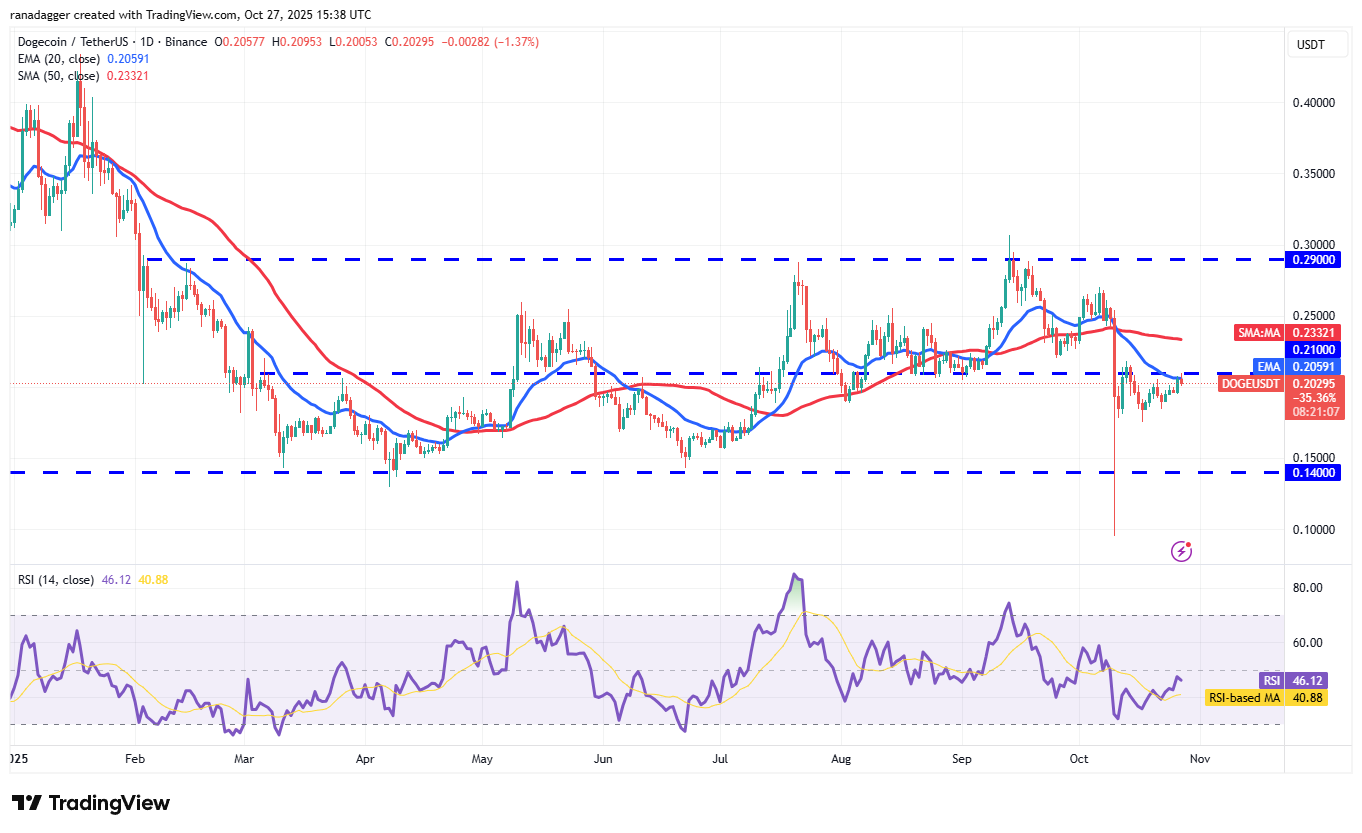 Dogecoin (DOGE) has reached the 20-day EMA ($0.20), which is a near-term resistance to watch out for.