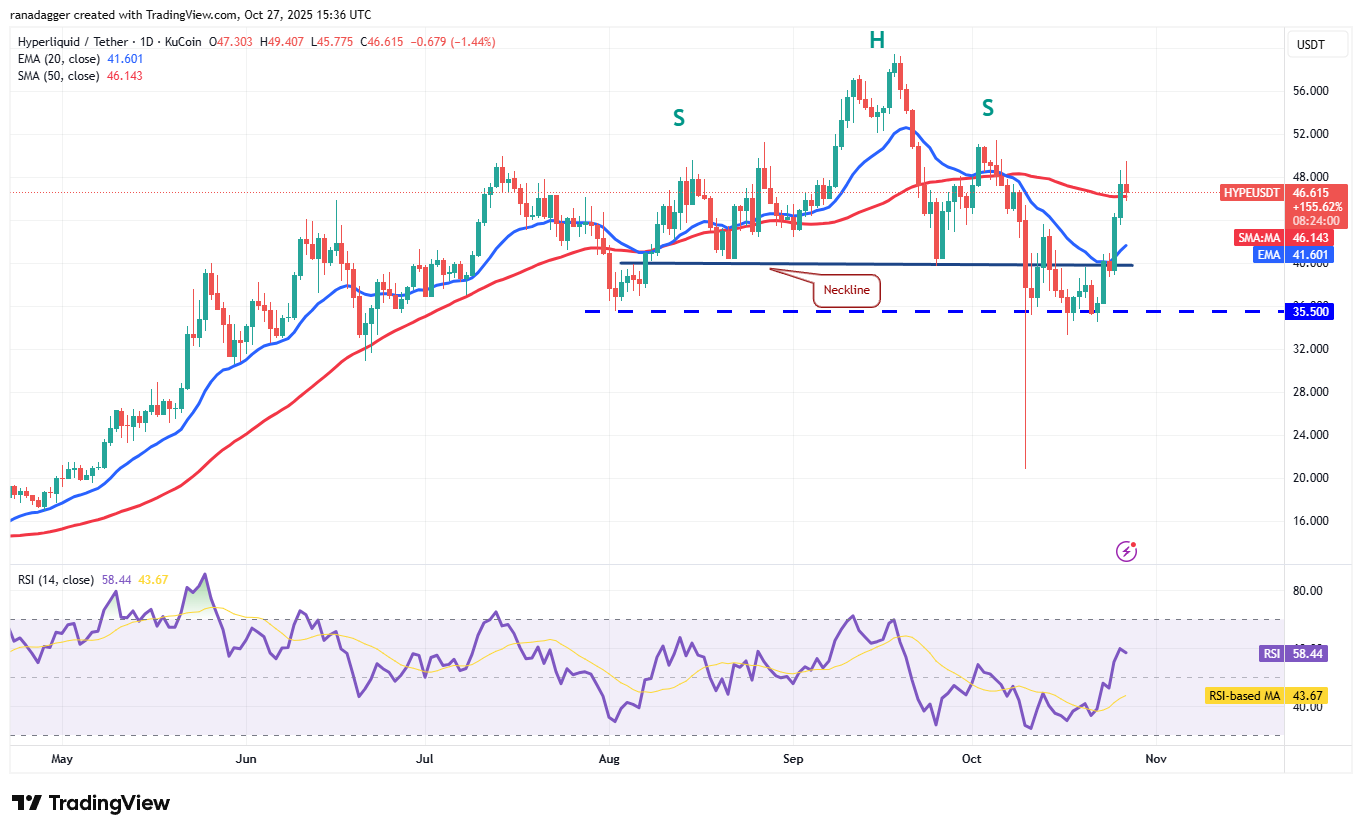 Hyperliquid (HYPE) broke above the 20-day EMA ($41.60) on Saturday and followed that up with a break above the 50-day SMA ($46.14) on Sunday.