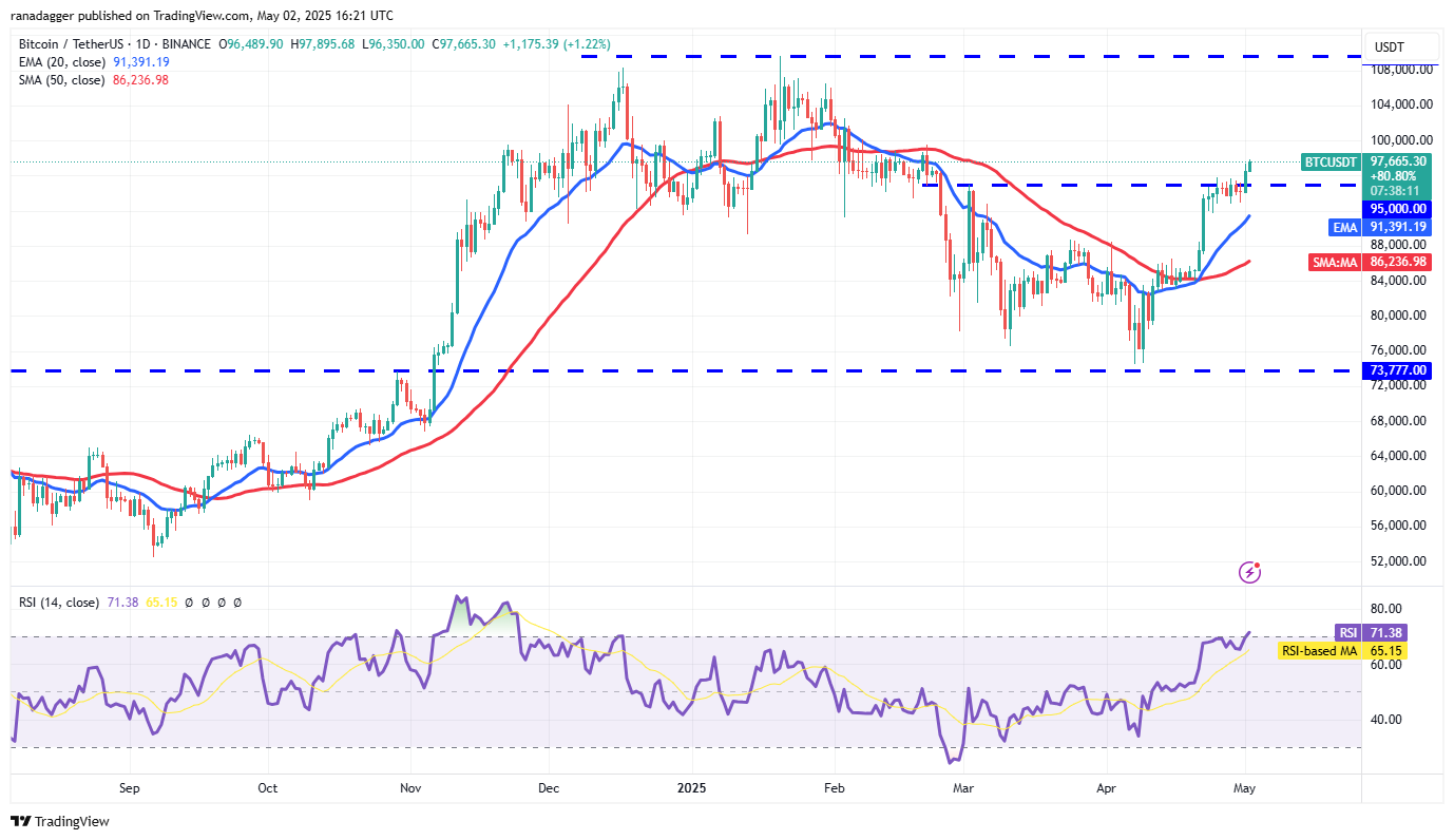 Bitcoin (BTC) recently broke above the $95,000 resistance on May 1st, signaling bullish momentum. The next target for buyers is the psychologically significant $100,000 mark, where a significant battle between bulls and bears is expected. Veteran trader Peter Brandt has suggested a potential rally to $125,000-$150,000 by August or September 2025, assuming Bitcoin reclaims its previous parabolic trajectory. However, he also cautioned that this could be followed by a substantial correction exceeding 50%.