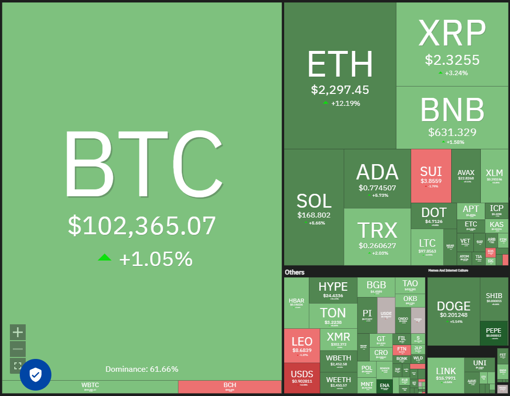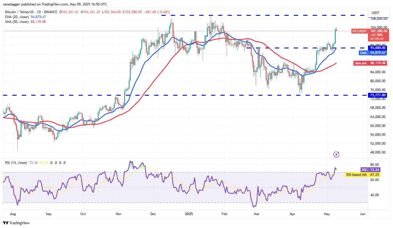 The BTC/USDT pair could reach the $107,000 to $109,588 zone, where significant bear resistance is anticipated. The overbought relative strength index (RSI) suggests a potential short-term pullback.