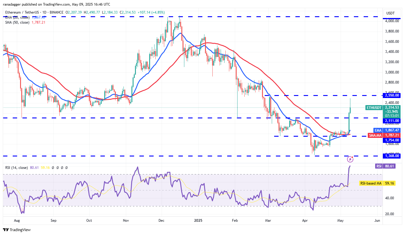 Ether (ETH) surged past the $2,111 resistance on May 8th, reaching nearly $2,550 on May 9th.