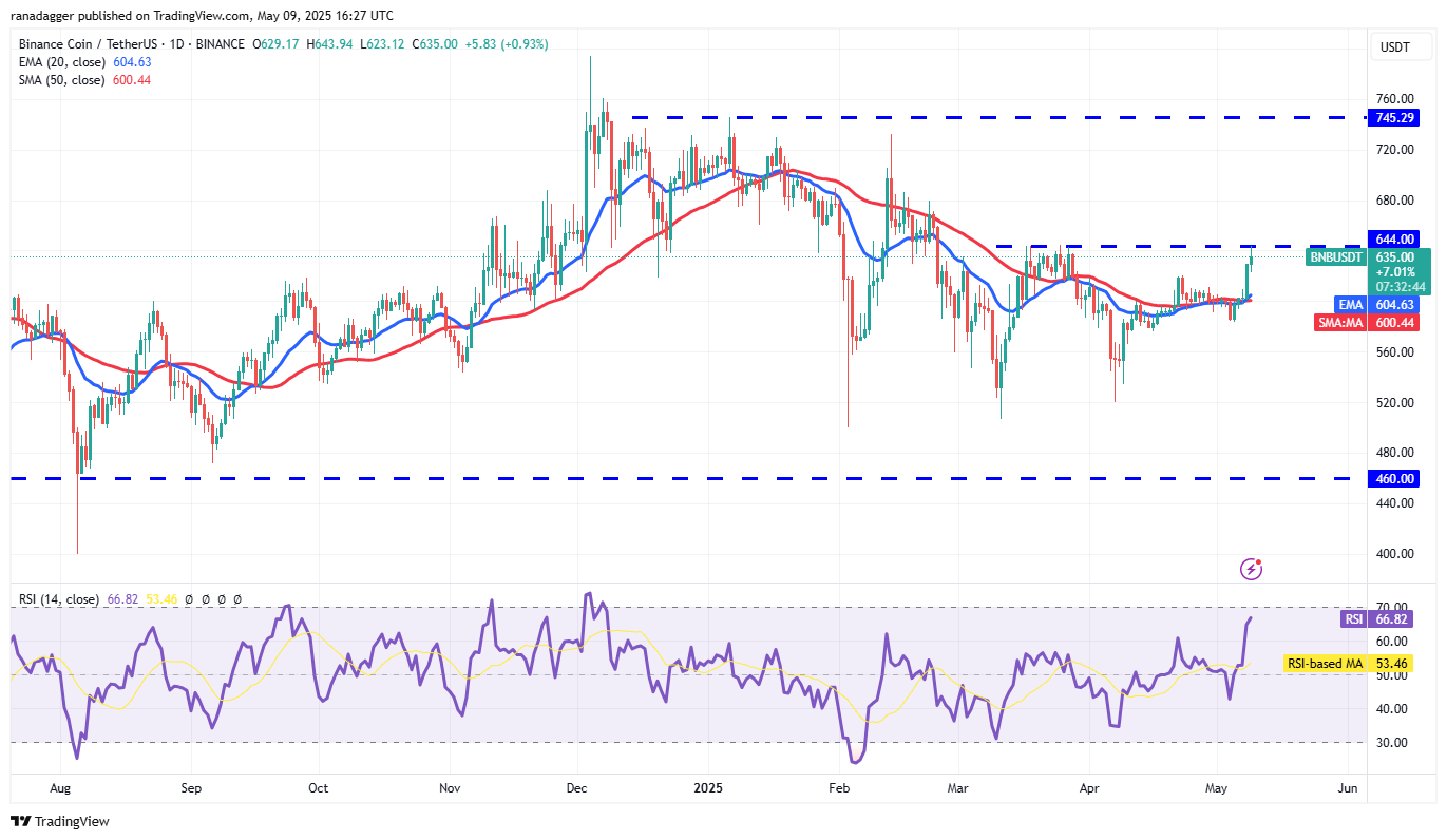 The BNB/USDT pair reached $644 on May 9th, a level expected to provide strong resistance. However, if buyers maintain pressure and break through $644, the pair could rise to $680. Bears would need to defend $644 aggressively and push the price below the moving averages to halt the uptrend, potentially leading to a decline to $580.
