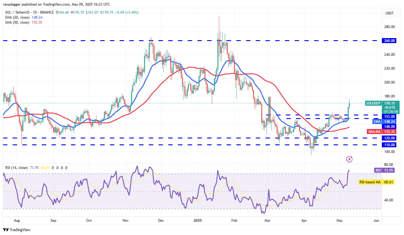 Solana (SOL) broke and closed above the $153 resistance on May 8th, suggesting bullish control.