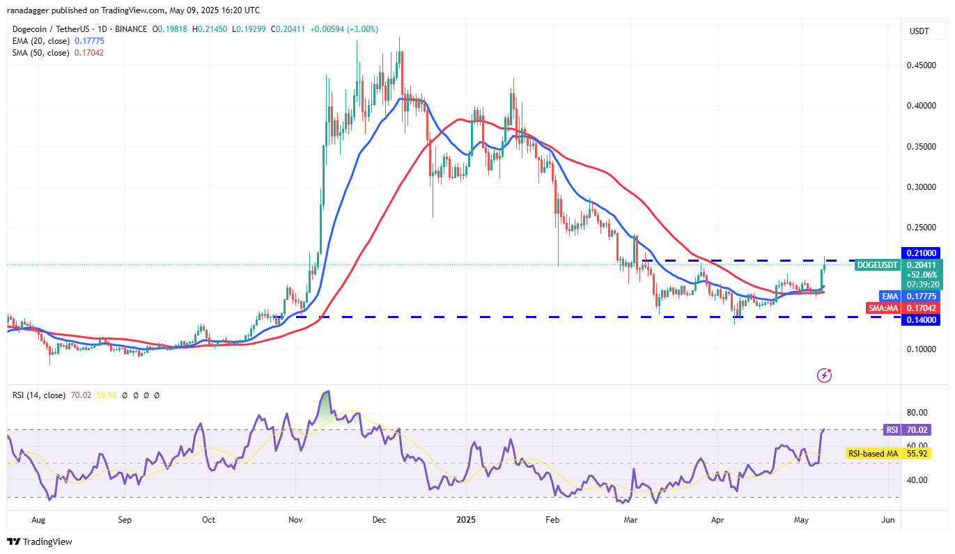 Buyers defended the moving averages and pushed Dogecoin (DOGE) to resistance at $0.21.