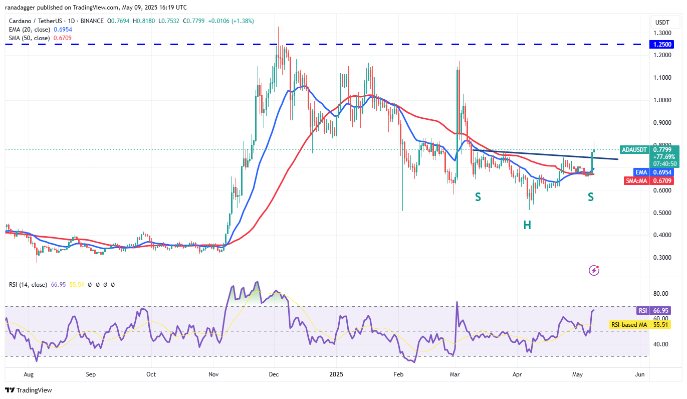 The upward-trending 20-day EMA ($0.69) and positive RSI indicate buyer advantage. If the price remains above the neckline, the ADA/USDT pair could surge towards the pattern target of $1.01, potentially overcoming resistance at $0.83. Bears would need to push the price below the 50-day SMA to prevent this, potentially leading to a decline to $0.60 and then $0.50.