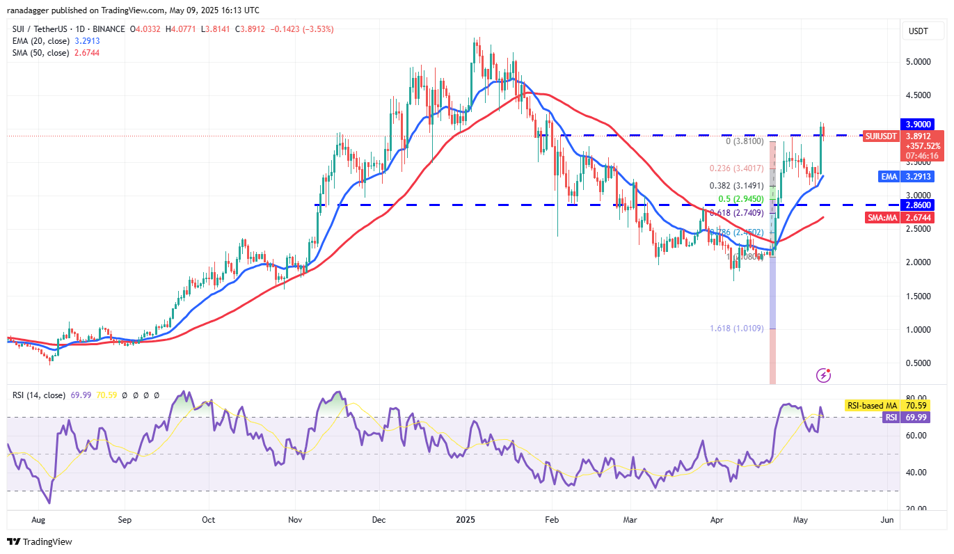 Sui (SUI) rallied sharply from the 20-day EMA ($3.29), surpassing the $3.90 resistance on May 8th.