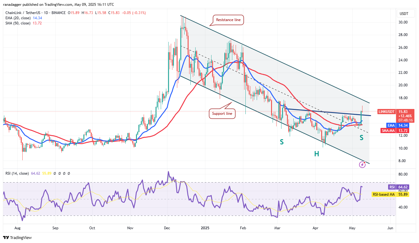 Chainlink (LINK) rebounded sharply from the 50-day SMA ($13.72) on May 8th, completing an inverse head-and-shoulders pattern.