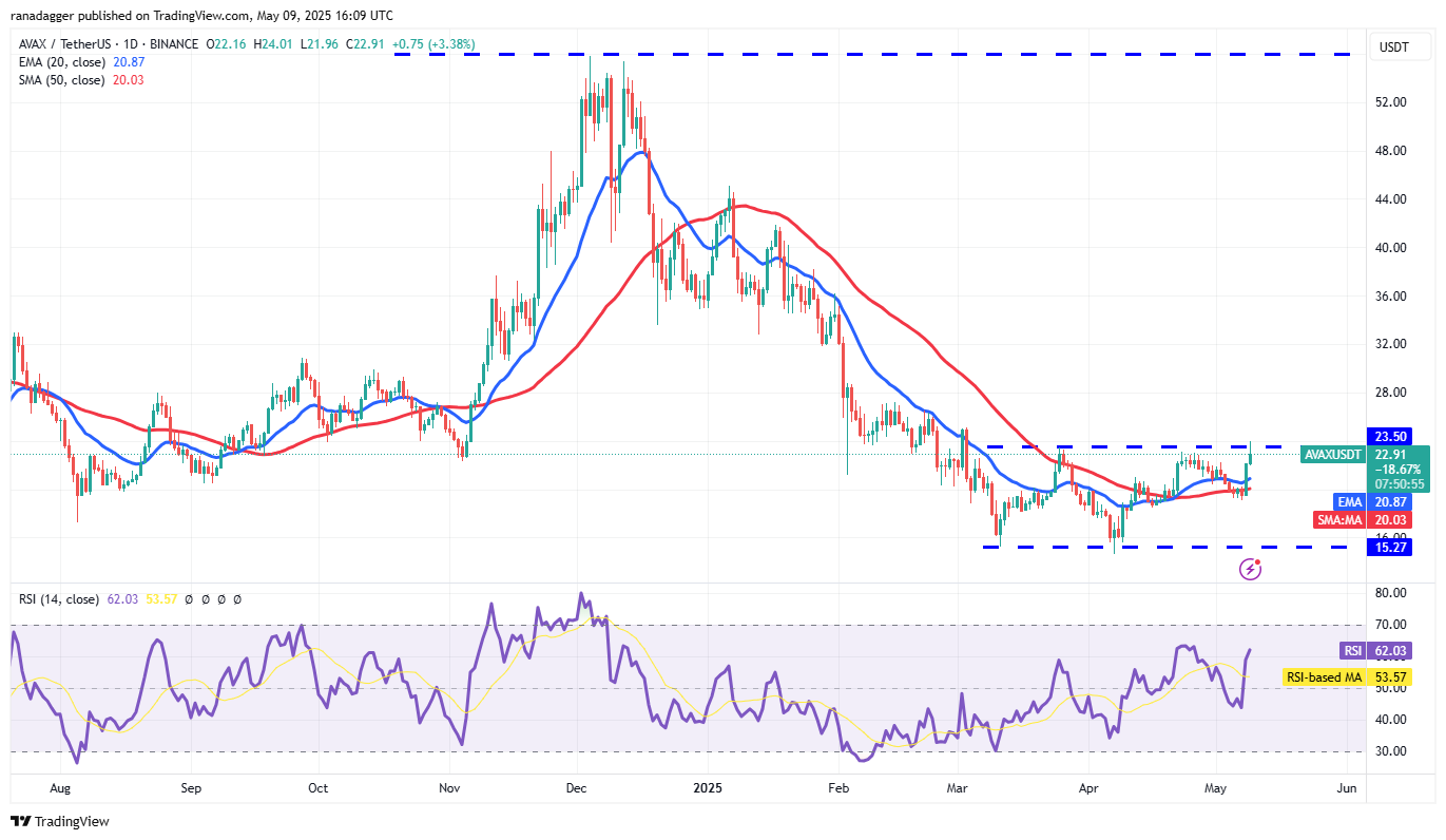Avalanche (AVAX) bounced off moving averages on May 8th, reaching overhead resistance at $23.50 on May 9th.