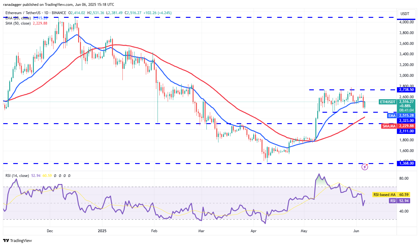 Ether (ETH) reversed direction and dropped below the 20-day EMA ($2,515) on June 5, suggesting short-term traders are taking profits.