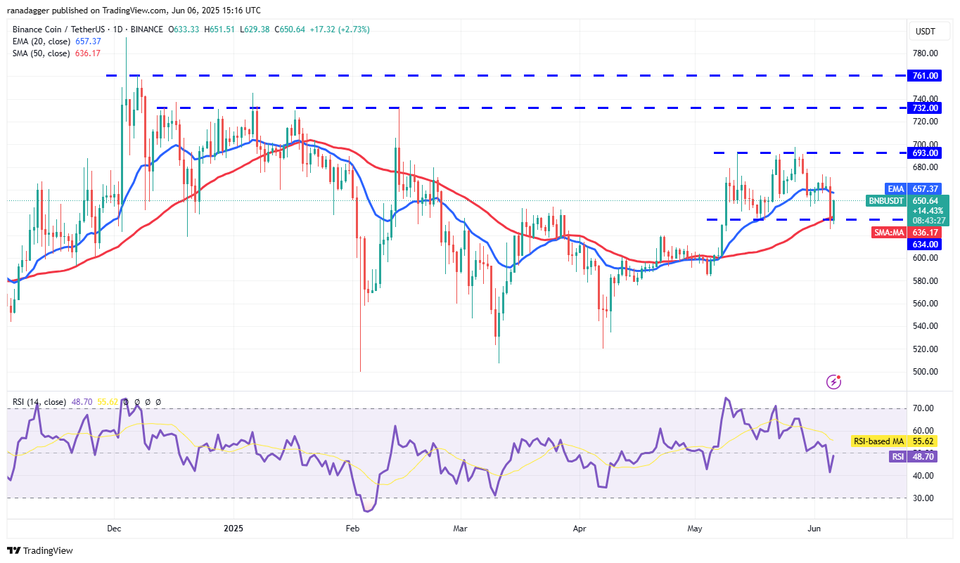 BNB (BNB) dropped below the 20-day EMA ($657) on June 5 and moved toward the 50-day simple moving average (SMA) ($636).