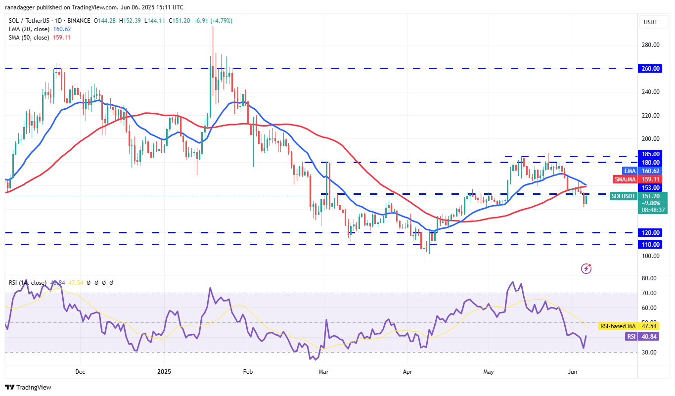 Solana’s (SOL) inability to rise above the 20-day EMA ($160) on June 3 attracted sellers, pushing the price below the $153 support on June 5.