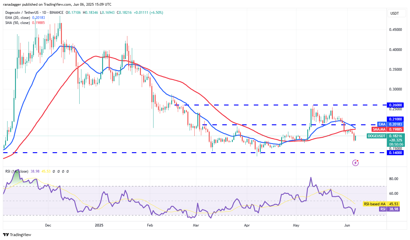 Buyers are trying to defend the $140 support, but the relief rally is likely to face resistance at the 20-day EMA. If the price turns down sharply from the 20-day EMA, the likelihood of a break below $140 increases. The SOL/USDT pair could then drop to $120. Buyers are expected to defend the $120 to $110 support zone.