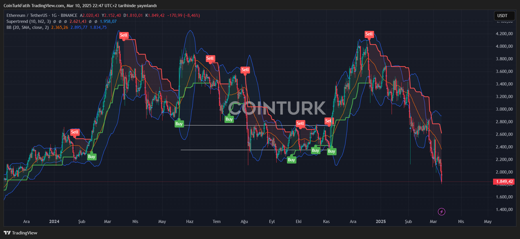 ETH has fallen to $1,800, a level not seen since the recovery following the November 2023 crash. This represents a return to its starting point after 496 days, despite briefly exceeding $4,000 during that period. The breakdown of the $2,150 support level contributed to the current downturn. Reclaiming this support could potentially push the price towards resistance levels at $2,350 and $2,734.