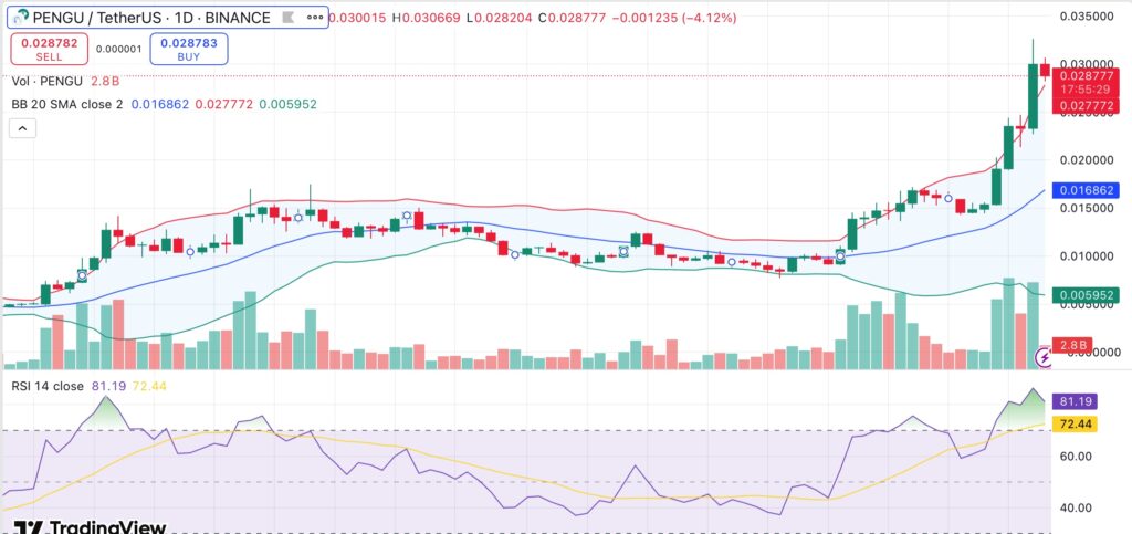 A continuation towards the $0.035–$0.04 range remains plausible if PENGU can sustain its current momentum. The 20-day moving average, near $0.025, could provide support in the event of a correction. While overbought signals warrant caution, the bulls are presently in control of the market.