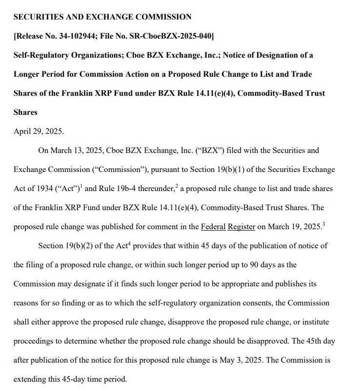 The SEC has delayed its deadline for reviewing Franklin's XRP Fund. Source: SEC