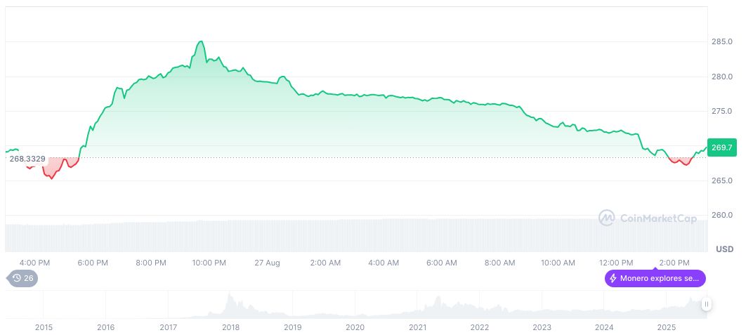 As of August 27, 2025, Monero trades at $269.20. With a market cap of 4.97 billion USD and 0.05% price increase in 24 hours, market reactions remain tense post-attack.