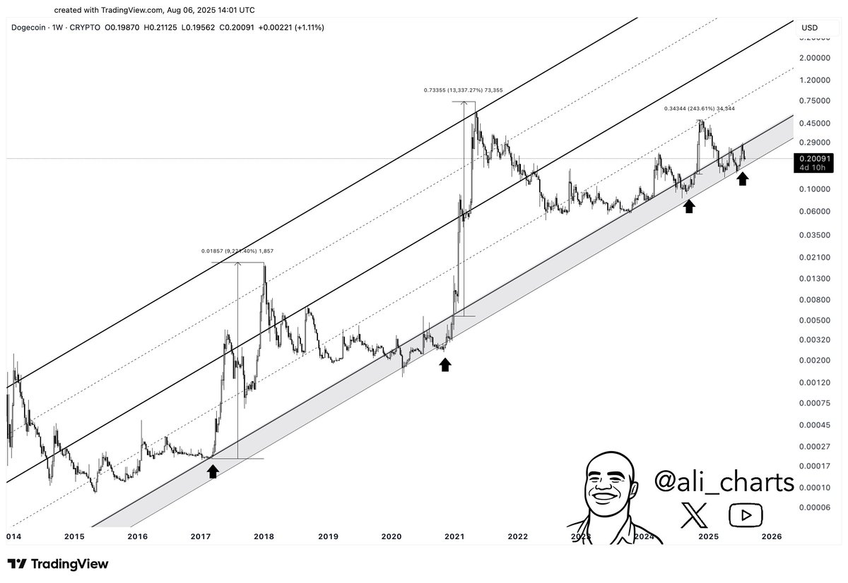 Technical analysts point to a rising channel pattern, a historical indicator of significant rallies, reinforcing confidence in long-term Dogecoin price predictions.