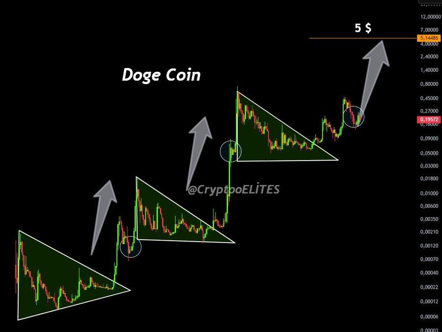 CryptoElites also shared a historical Dogecoin chart, showcasing repeated symmetrical triangle formations that have previously preceded sharp price increases. Each cycle has followed a similar pattern of consolidation and breakout, often culminating in a vertical rally.