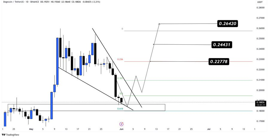 The recent pullback has brought the price back to the triangle’s apex, currently hovering around $0.177. Tardigrade highlighted that “this area represents a structural foundation,” as the price is now testing a confluence zone with significant historical relevance.