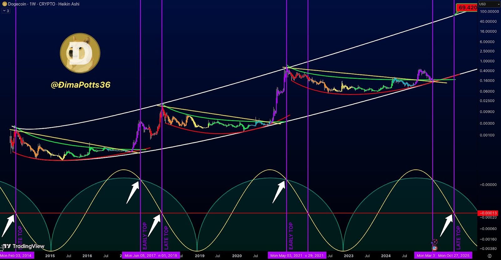 Crypto analyst Dima Potts anticipates a significant Dogecoin rally. A chart indicator suggests an upward trajectory, potentially culminating in a cycle top later this year.