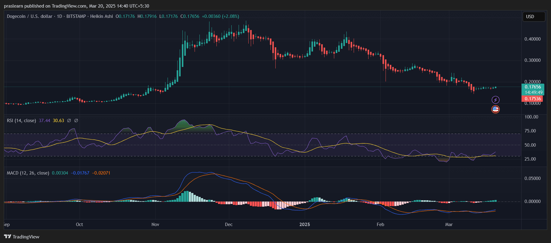 Dogecoin's price has trended downward since its peak during the last bull run. However, it shows signs of stabilization, currently trading around $0.1765. The Relative Strength Index (RSI) stands at 37.44, suggesting DOGE is approaching oversold territory, potentially triggering a price reversal.