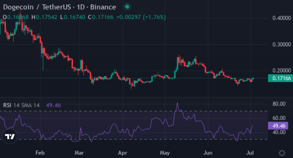 Analyzing the current data, Dogecoin's future direction appears uncertain. The Relative Strength Index (RSI) suggests the coin is neither overbought nor oversold. The Simple Moving Average (SMA) is slightly above the longer-term SMA, indicating a potential short-term trend. However, the Moving Average Convergence Divergence (MACD) level shows only slight momentum.